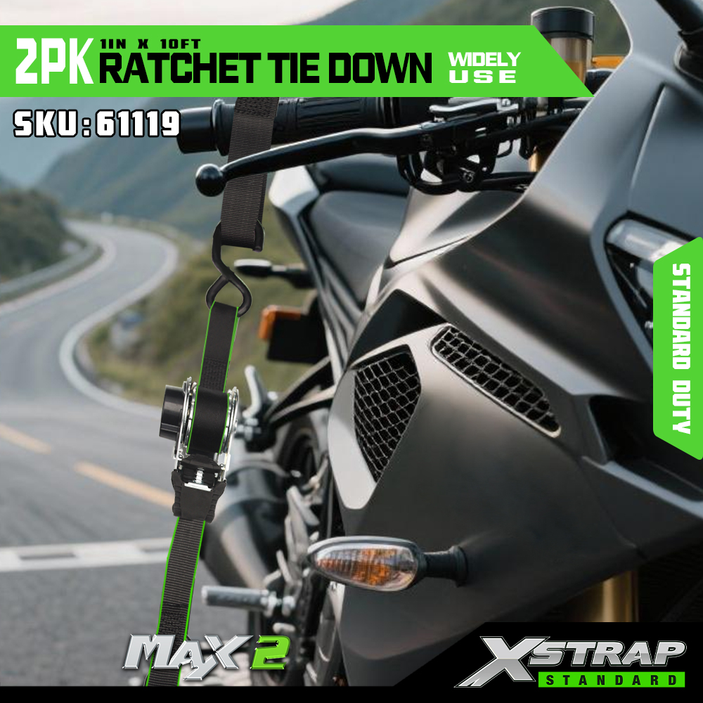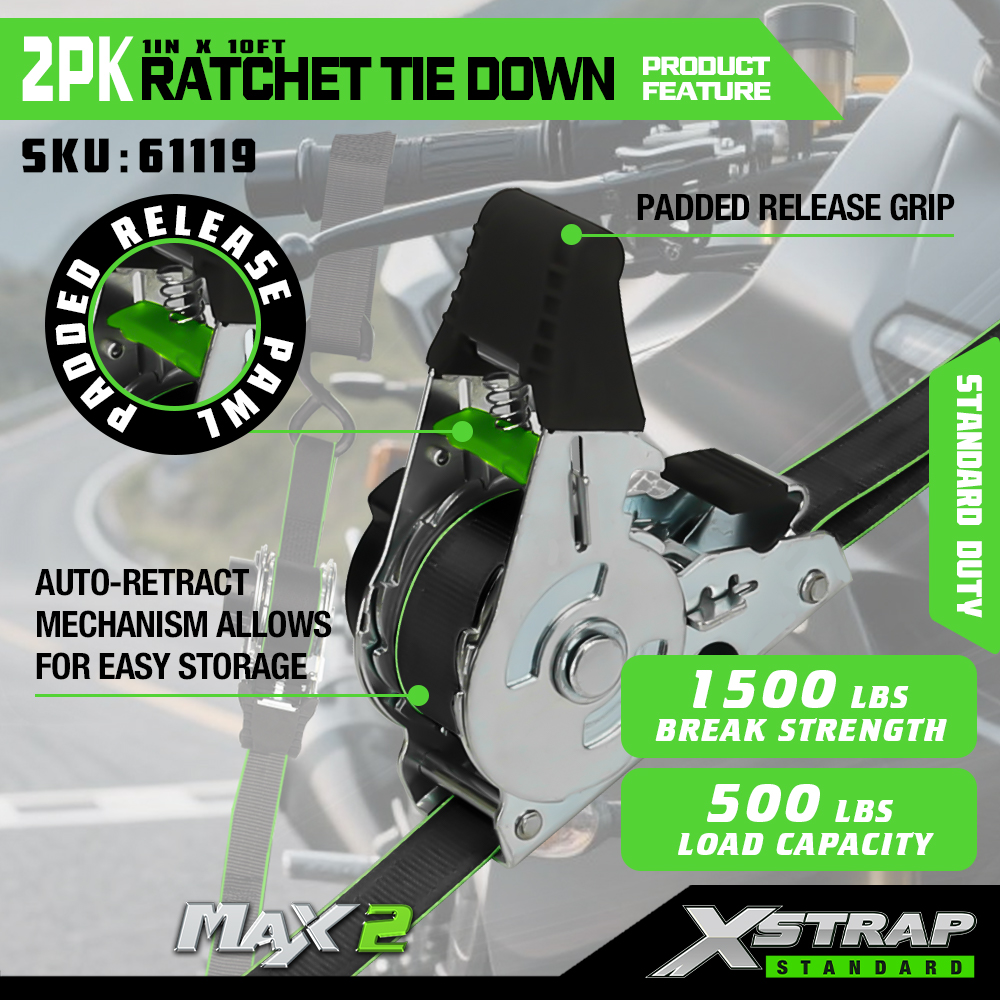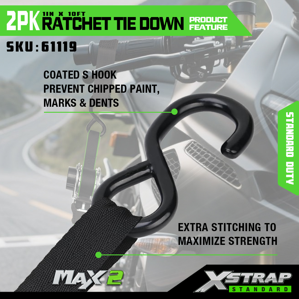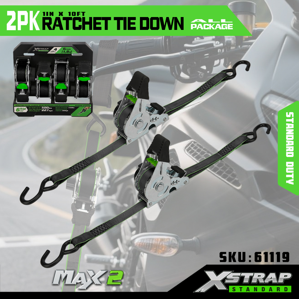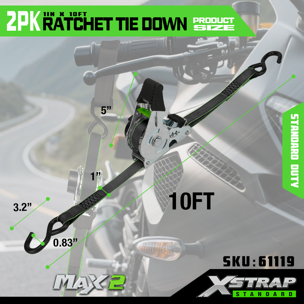 Xstrap 2 Pacáiste Ratchet Ceangail Síos, 1” x 10’ poileistir Ceangail Síos Strap Tarraingt Ratach Strap, Toilleadh 500 lbs Lashing Lasta Strapaí Daingnithe le S Hooks do Truck Pickup, SUV, Carranna Barr Gluaisrothar, Bád Iascaireachta Éadrom, Sciála Scaird, Lorgaire Sneachta.