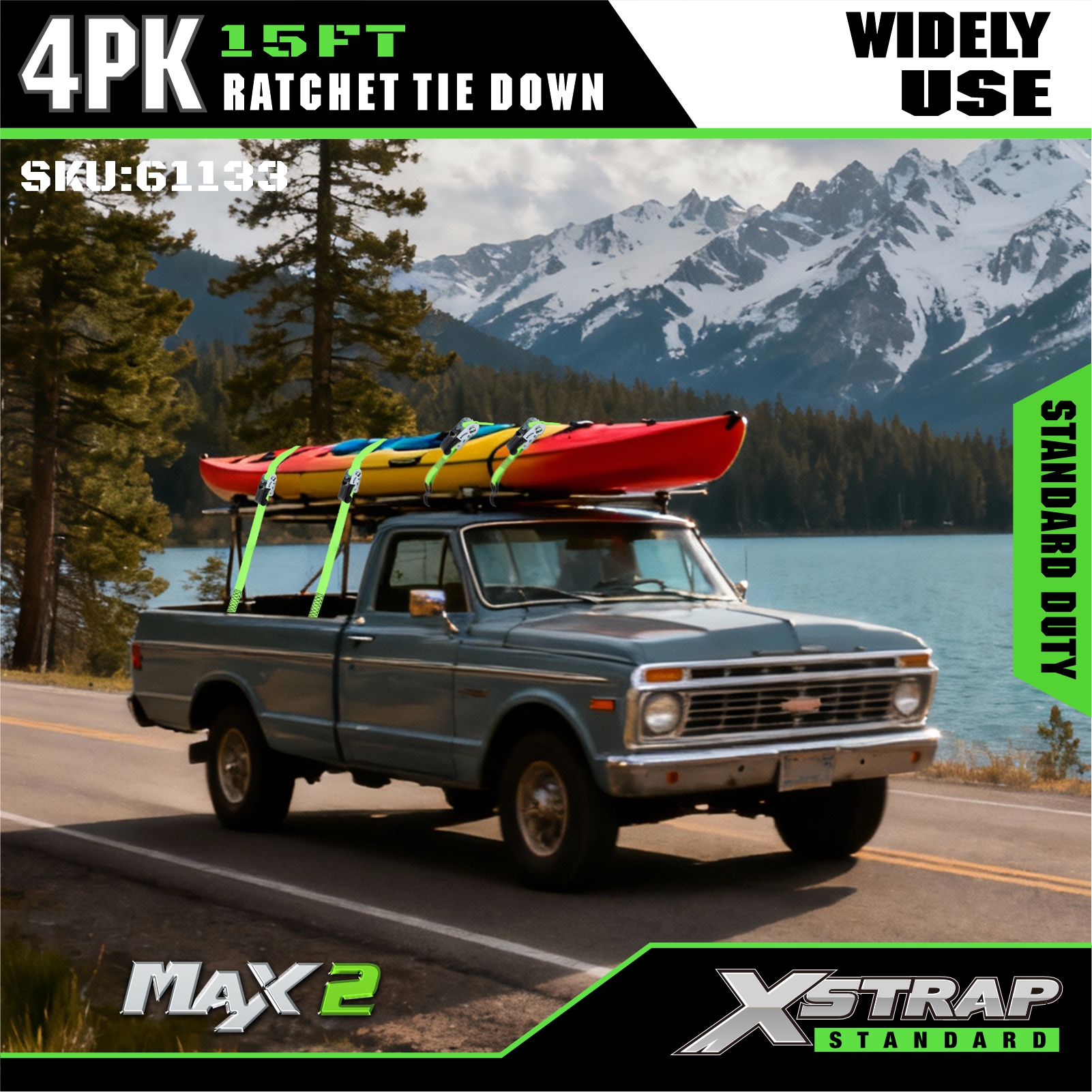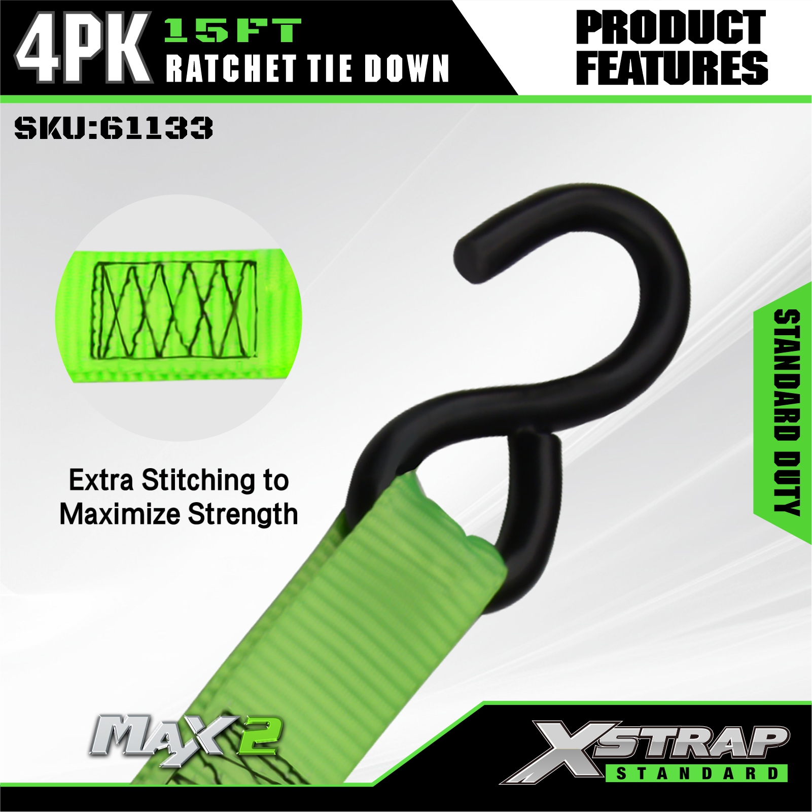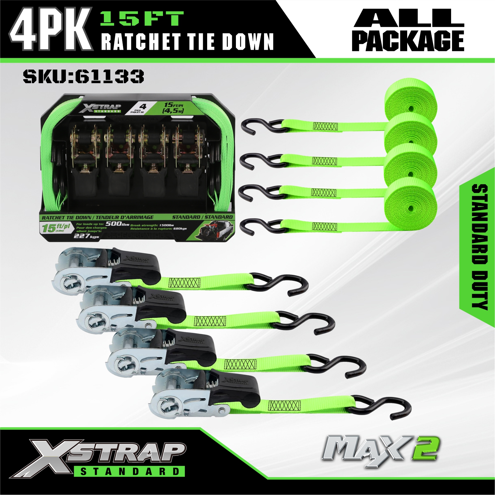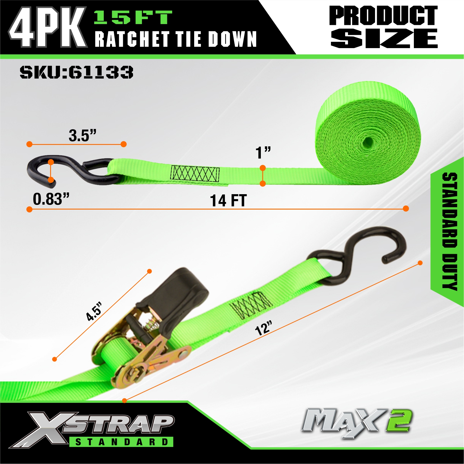 Xstrap 4 Pacáiste Ceangail Ratchet Síos, 1” x 15’ poileistir Ceangail Síos Strap Tarraingt Raitse, Toilleadh 500 lbs Lasta Lashing Strapaí Daingnithe le S Hooks do Truck Pickup, SUV, Carranna Barr Gluaisrothar, Bád Iascaireachta Éadrom, Scaird-sciála, Trascaire Lawn, Gluaisrothar Láir.