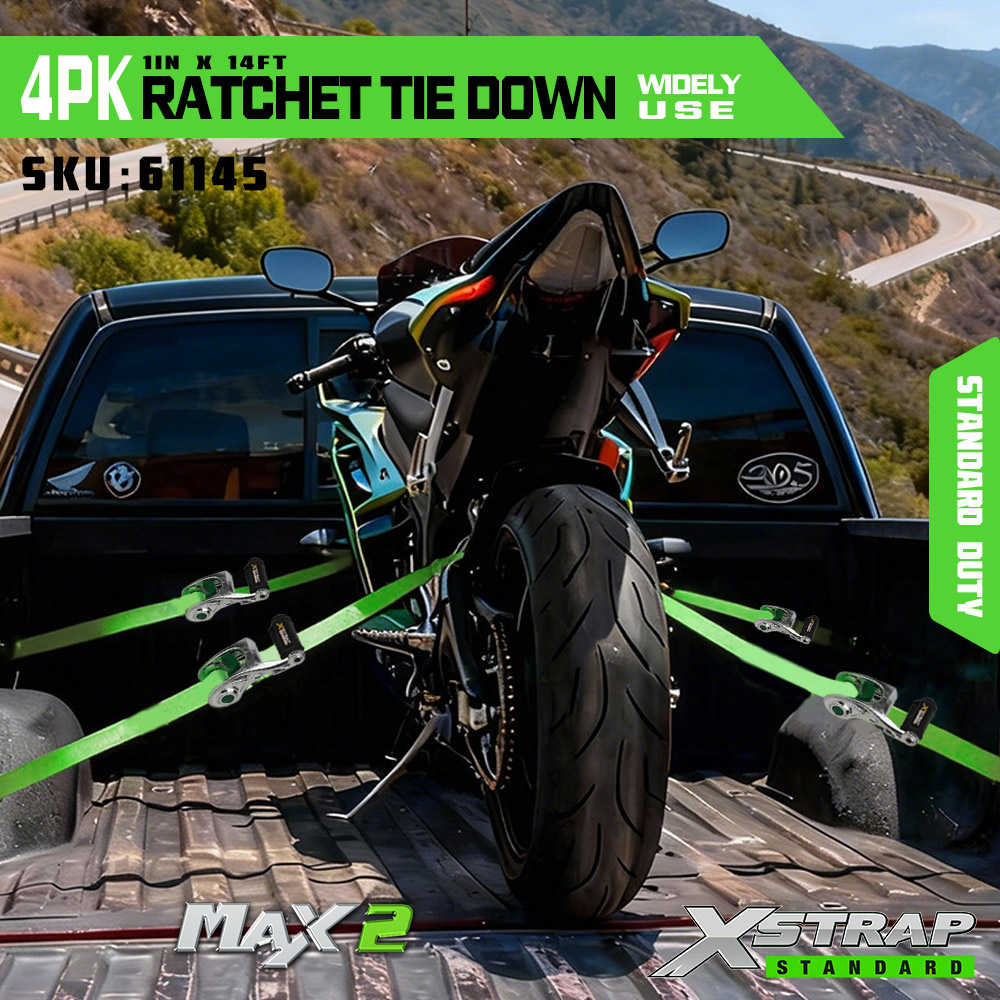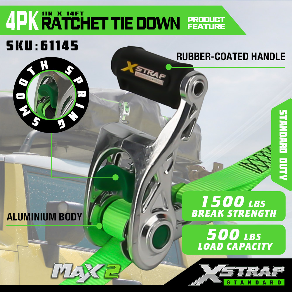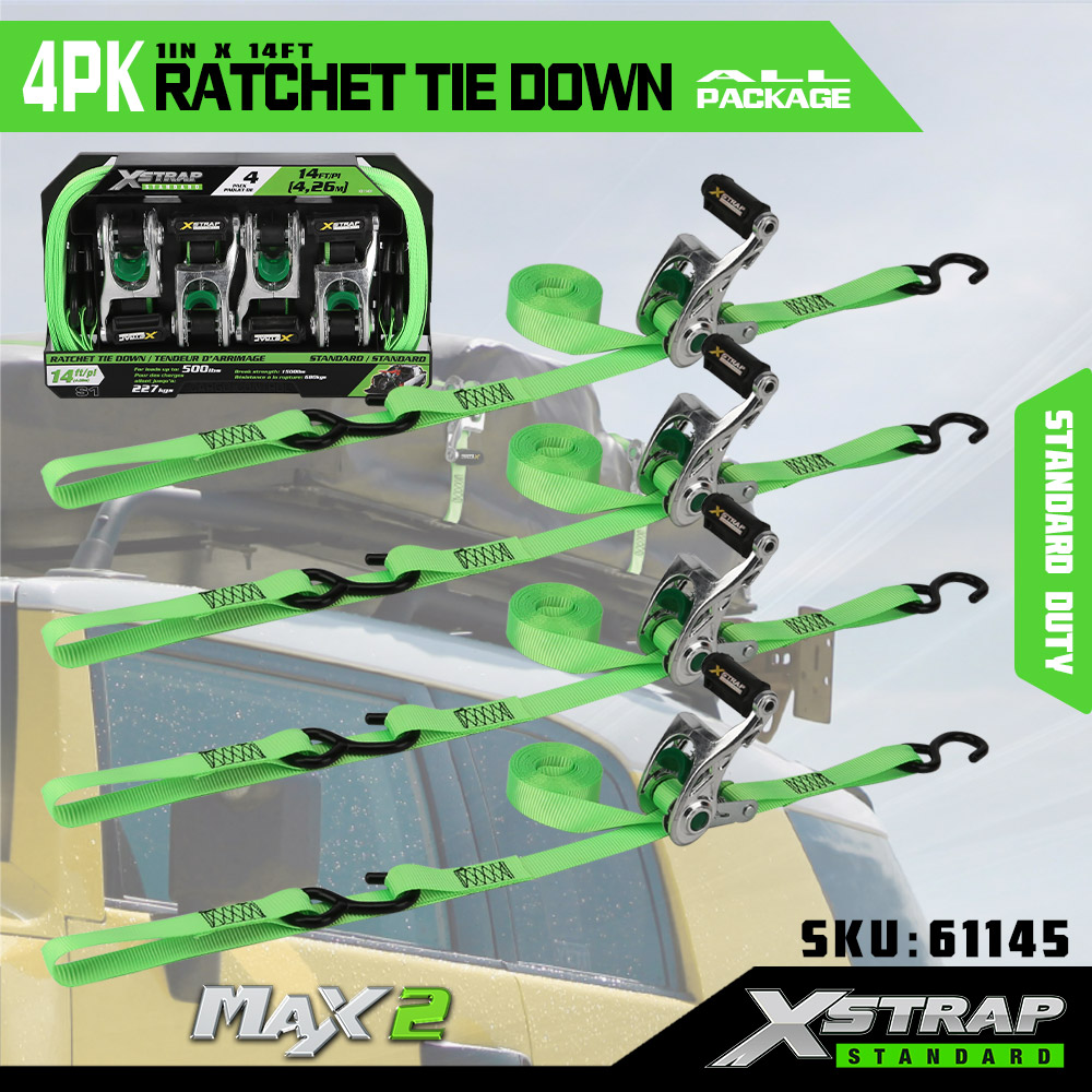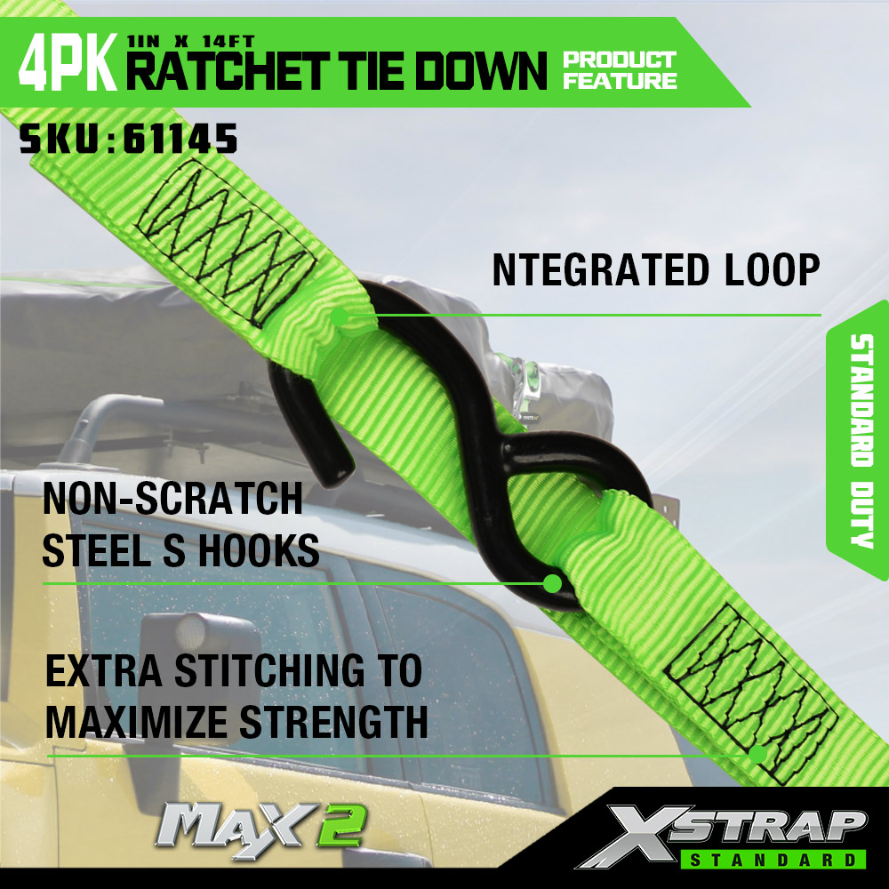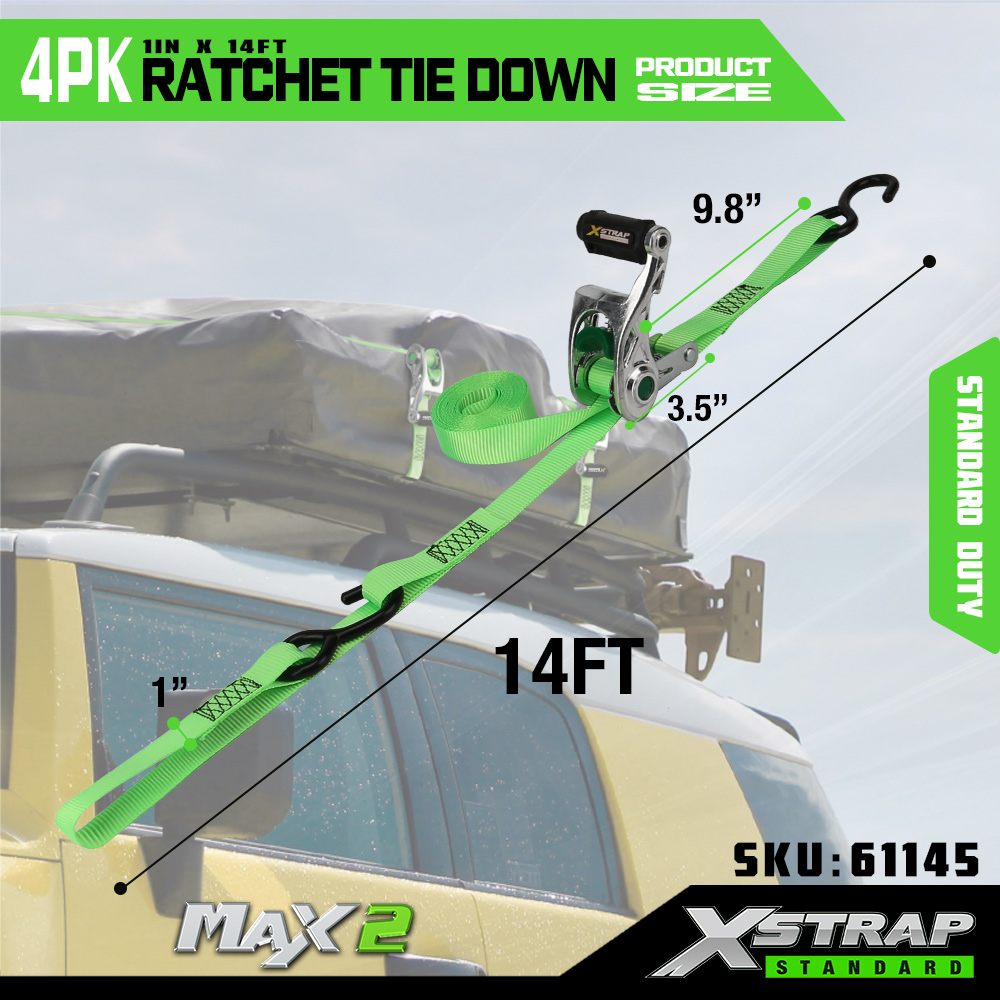 Xstrap 4 Pacáiste Ratchet Ceangail Síos le Lúb Bog, 1” x 14’ poileistir Ceangail Síos Strap Tarraingt Strap Ratchet, Toilleadh Lasta 1000 Lashing Strapaí Daingnithe le S Hooks do Truck, SUV, Racks Barr Gluaisrothar.
