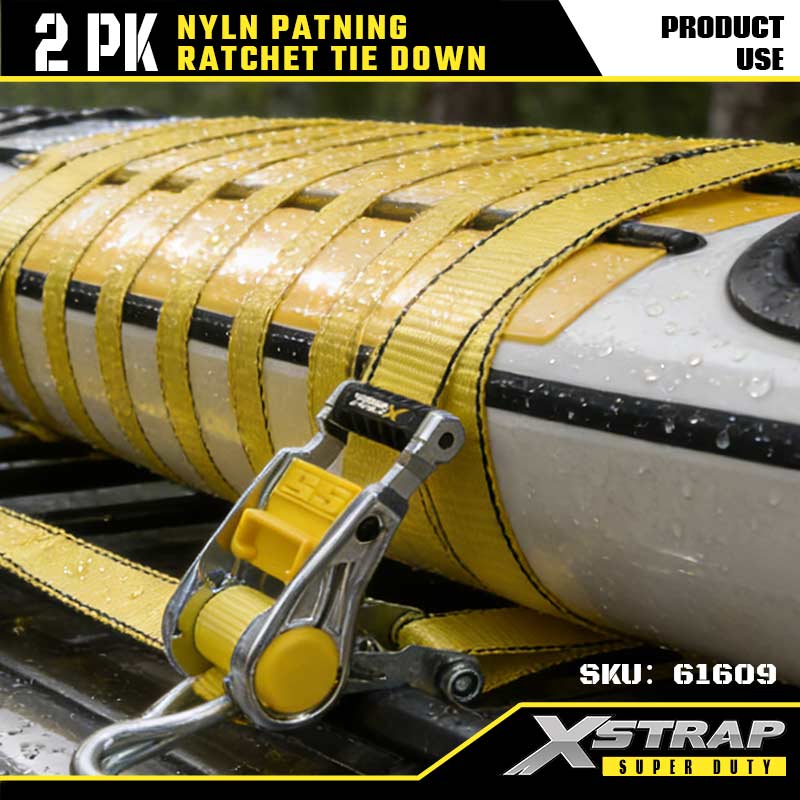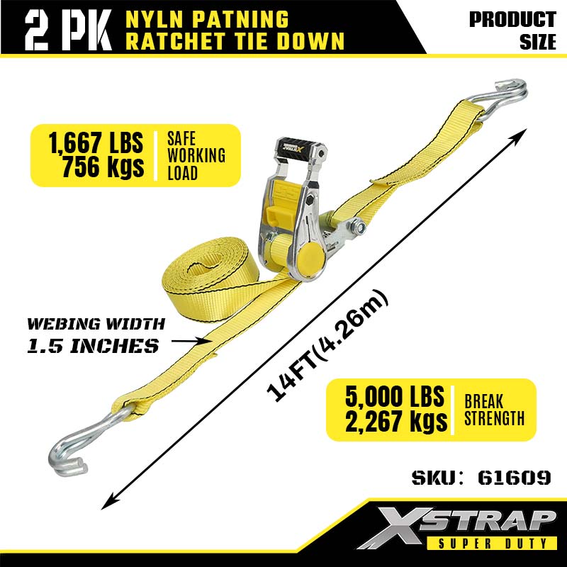 - 2 Pacáiste 14FT Méid: Leathnaíonn leithead 1.5 orlach teannas go cothrom chun damáiste a sheachaint. Tá fad 14 troigh oiriúnach do leantóirí leapacha trucail nó do racaí dín. Tugann an pacáiste 2 go leor strapaí duit chun trealamh mór nó neamhrialta a dhaingniú.