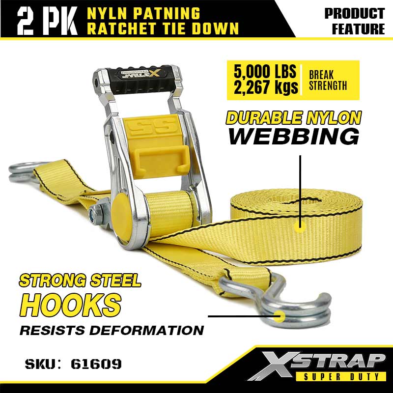 Xstrap 2PK Ratcet Ceangail Síos le Dúbailte J Hooks, 2” x 3.6’ poileistir Ceangail Síos Strap Ratchet Strap, 1667 lbs Toilleadh Lasta Lashing Strapaí Daingnithe le Dúbailte J Duáin do Leantóir Dualgas Trom, Leantóir Leaba Réidh Bád sciála, Carr Beag, Trealamh Trom.
